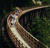 Just south of Kelowna is Myra Canyon, a lovingly restored section of the Kettle Valley Railway Trail. It weighs in at 12 miles (24 km) round trip, but there are no steep climbs or hairball singletracks - just some fun, casual riding. What makes the Myra Canyon section special are the 18 trestles and two tunnels you'll pass over and through. You can also rent bicycles at Myra Canyon Bicycle Rental/ Our guest who've done it were quite happy with it, |
